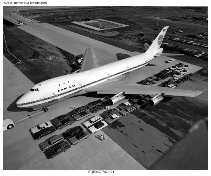 Pan Am Boeing 747 size comparison next a lines of automobiles