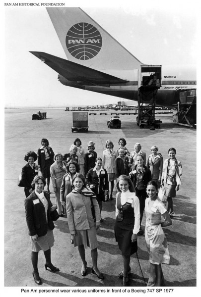A Pan Am crew poses in front of a Boeing 747 SP