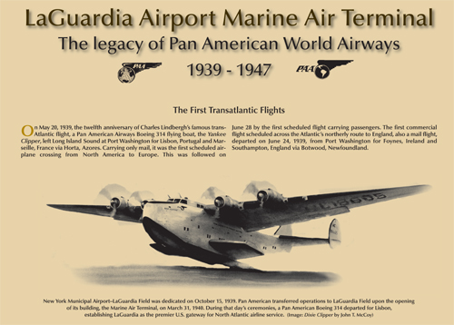 Designed as an international port, LaGuardia Field became one in fact March 31, 1940 when Pan American Airways' Yankee Clipper surged off the murky waters of Rikers Island Channel on the first scheduled flight from the field to Lisbon, Portugal. The seaplane terminal originally planned for occupation by Air France, British Overseas Airways, Deutsche Lufthansa and possibly other foreign airlines, is now completely occupied by Pan American since wartime restrictions ended - at least temporarily- the dreams of foreign airmen for regular transatlantic schedules.