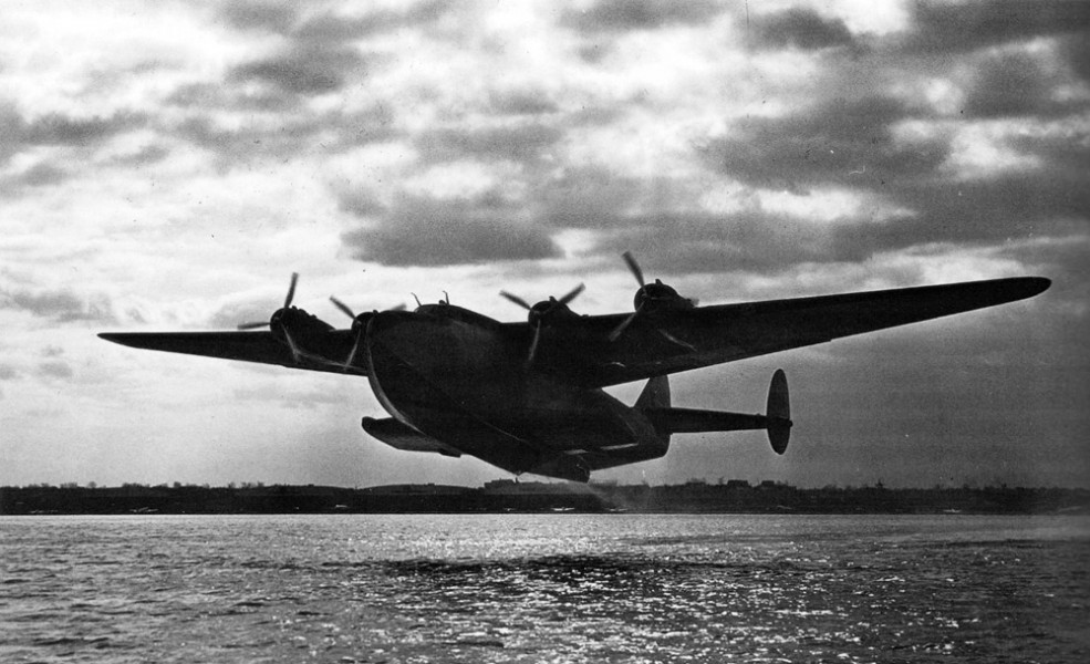 Pan Am Boeing 314 takes off at dawn during wartime, World War Two