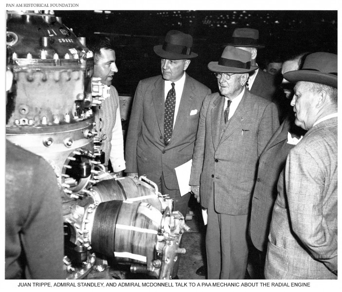 Pan Am Juan Trippe and Navy brass inspect Boeing 314 engine maintenance work, World War Two