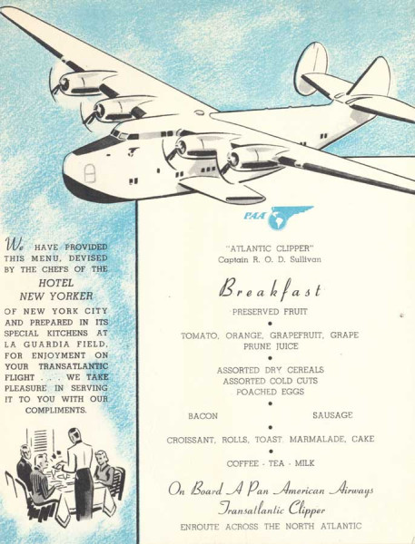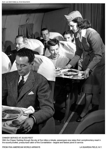 Traveling onboard Pan Am's big Clippers involved long hours taken up with reading, games and dining. Onboard heating of food came in 1935 for inflight meal preparation, with elaborate multi-course meals served on china and formal table settings.