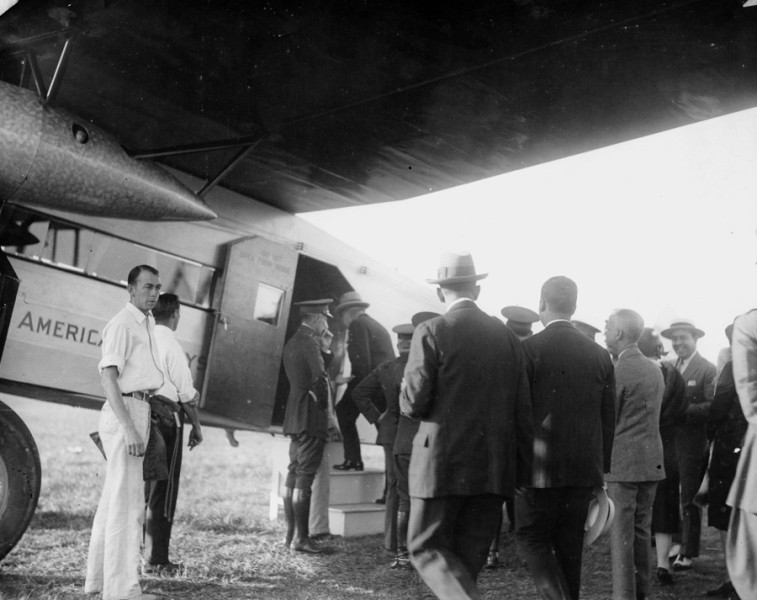 Pan Am's Juan Trippe speaking with Cuban President Machado by a Fokker TriMotor